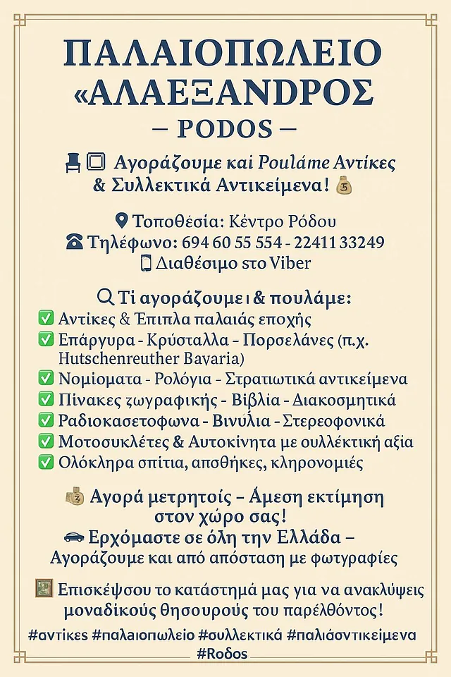 Στο παλαιοπωλείο ΑΛΕΞΑΝΔΡΟΣ, στην Κρεμαστή Ρόδου, σας περιμένει μια προσεκτικά επιλεγμένη συλλογή μοναδικών αντικειμένων τέχνης και αξίας, ικανή να καλύψει κάθε αισθητική και στυλ.